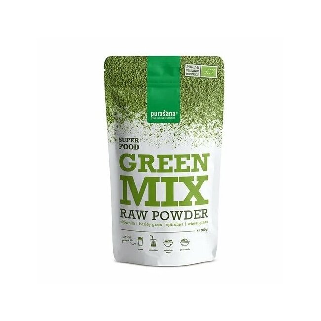 Purasana Green Mix contient de la chlorelle, de la spiruline, de l'herbe de blé et de l'herbe d'orge pures, sans aucun additif supplémentaire. Le produit est certifié biologique et végétalien. Il est également exempt des allergènes gluten, lactose et soja.