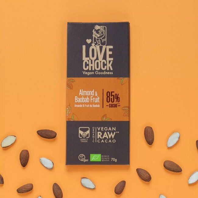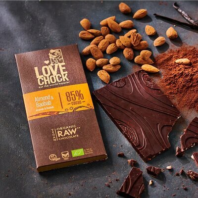 Sportifs chocophiles, laissez vous tenter par la Tablette de Chocolat Noir aux Amandes & Baobab de Lovechock : du chocolat 100% cru, à 85% de Cacao avec le croquant des Amandes !