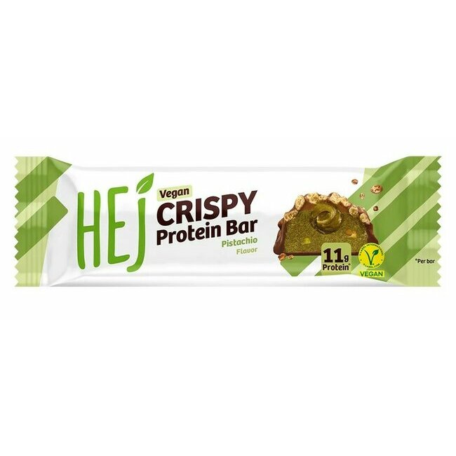 Idéale en collation, la barre protéinée croustillante chocolat et pistache HEJ vous offre un délicieux en-cas riche en protéines et sans produits d'origine animale, adapté aux personnes actives, aux sportifs, aux végétariens qu'aux personnes désirant perdre du poids.