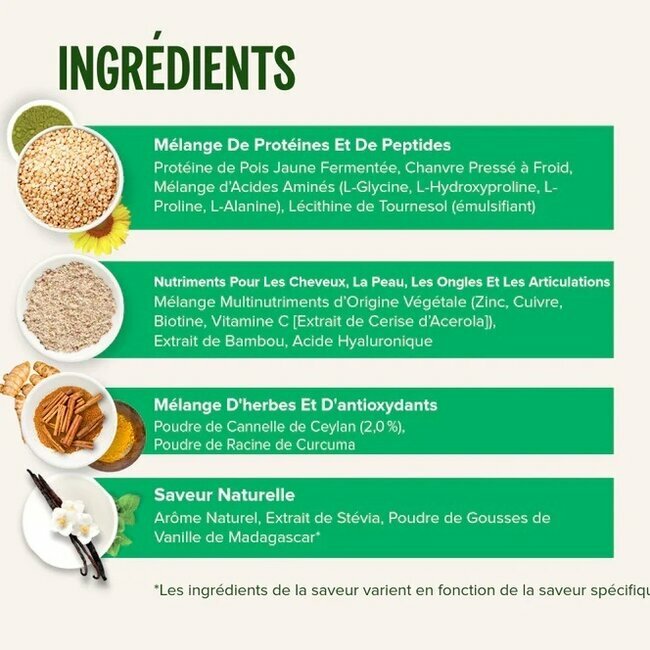 Ingrédients : Protéine de Pois jaune fermentée, protéine de Chanvre pressée à froid, mélange d'acides aminés (L-Glycine, L-Hydroxyproline, L-Proline, L-Alanine), Cacao en poudre (8.7%), émulsifiant : Lécithine de tournesol, mélange de sarrasin germé Vganic multi-nutriments, (zinc, cuivre, biotine, vitamine C (extrait d'acérola), extrait de Bambou, Acide Hyaluronique, édulcorant : glycosides de stéviol (extrait de stévia), poudre de racine de Curcuma.